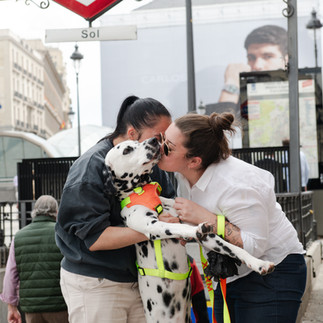 11.30h. Nos dimos cita en la Puerta del Sol, en pleno corazón de Madrid donde poco a poco fueron llegando los protagonistas de la jornada. Fue muy bonito ver cómo las caras de los que estaban en Sol se iluminaban y se emocionaban al ver estos preciosos perros, como no podía ser de otra manera, ellos hicieron gala de su simpatía y saludaban e incluso daban mucho cariño a quienes se acercaban a verlos.